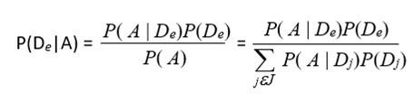Delta (Δ) is a probability space, where we can define a sigma-algebra of events, with a probability measure. Delta would be composed of all the events of A, that is, it is a partition of the sample space that is formed by all the people with symptoms, and “De =” is an event that is intersecting the events of delta, therefore we can calculate conditional probabilities and apply Bayes' theorem9.