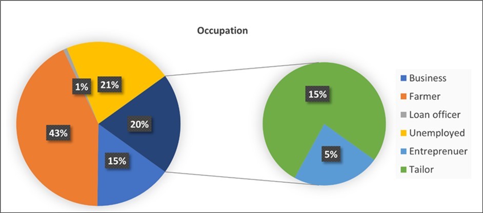 A total of 131 adolescent pregnant women aged 15-19 years participated in this study. The mean age of participants was (18 ± 0.9 SD) years. A large proportion aged 19 years (n=63, 48.1%), followed by 18 years (n=34, 26.0%), the rest (n= 34, 26.0 %) had 16-17 years. Majority of the women were married (n=83, 63.4%) while the rest (n=48, 36.6%) were unmarried. Regarding the gravidity (n= 86, 65.6%) were prime gravid while the rest (n=45, 34.4%) were gravida 2 and 3. Most of the women had primary education (n=85,64.9%) followed by secondary education (n=42,32.1%) and the rest (n=4,3.1%) had university and informal education (Figure 2). Moreover, majority of the participants were farmers (n= 56, 42.7%) followed by unemployed (n= 28, 21.4%) and the rest (n=47, 35.9%) were small business owners. With respect to their occupation, most women (n= 130, 99.2%) had an income less than Tshs.100,000/= (Figure 1).