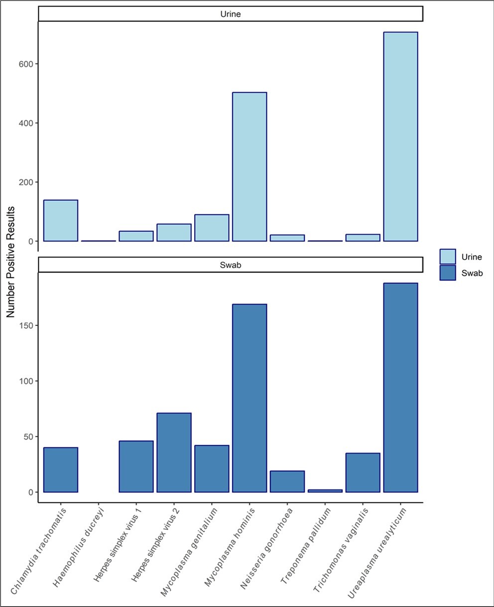 Figure 2.Number of positive results for each STI infection detected from urine and swab samples. The two most common STI infections detected in urine using the Confidante® kit were Ureaplasma urealyticum (n=707 urine, n=188 swab) and Mycoplasma hominis (n=503 urine, n=169 swab).