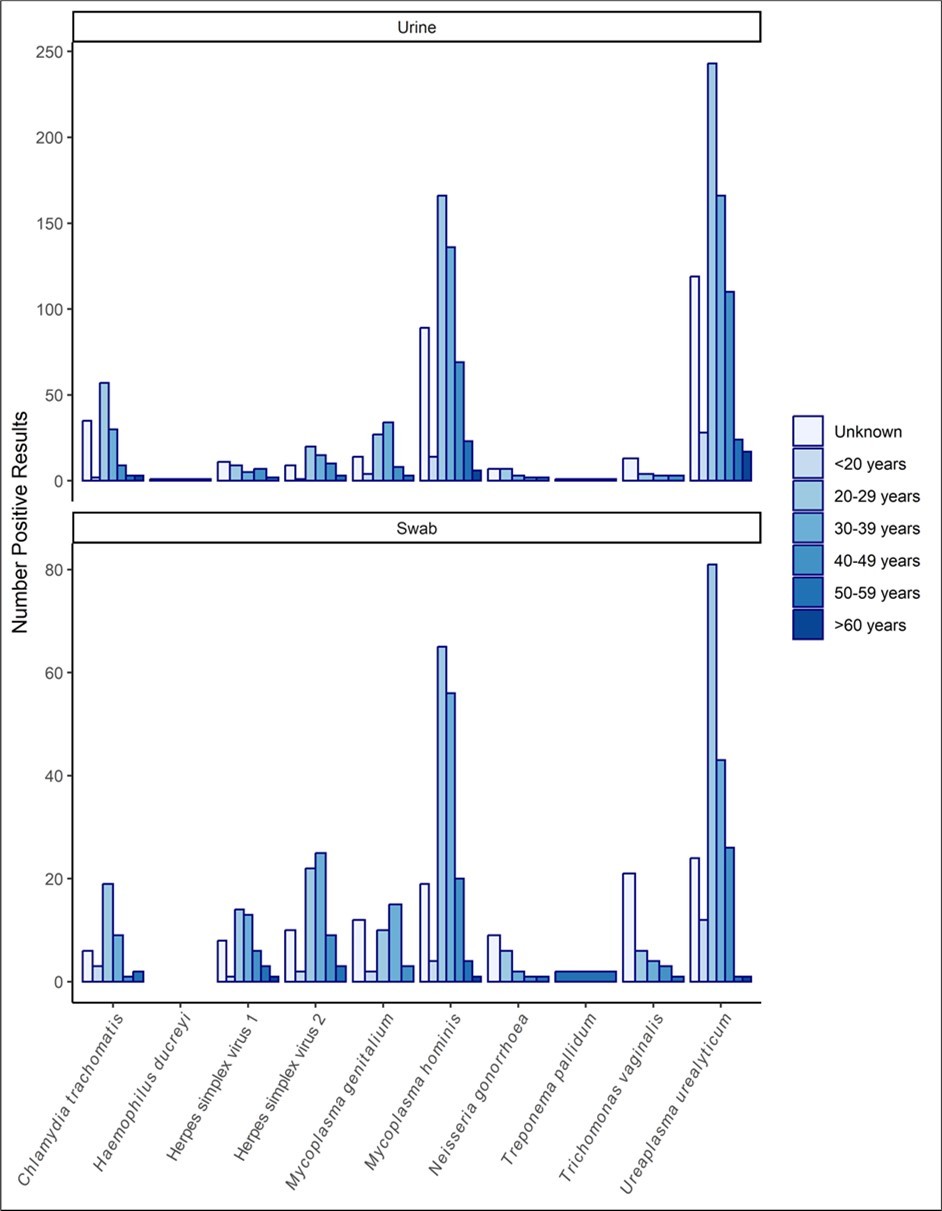 Figure 3.Number of urine and swab samples positive for STI infection by age group