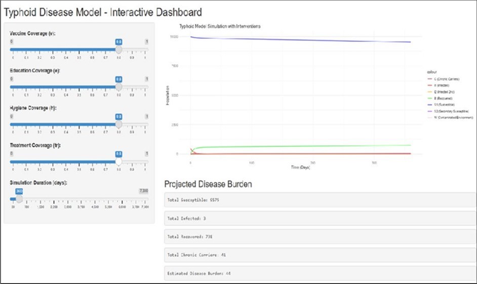 The model identified inadequate sanitation, contaminated water sources, and low health- seeking behaviors as primary drivers of typhoid transmission. In the absence of interventions, the model projected a sustained high rate of transmission. However, treatment and WASH interventions could reduce the disease burden by 50–60%, while combined strategies incorporating vaccination and education led to an 80% reduction in cases. Sensitivity analysis indicated that treatment and WASH interventions were particularly impactful at moderate coverage levels.